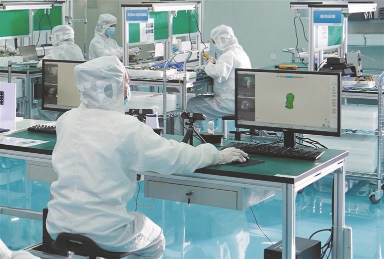 近年来,陕西聚焦自身优势发布“追光计划”,光子产业总产值以每年超过50%的速度递增,企业数从不足100家增至300多家,对全国的示范作用日渐明显。2023年,西安市光子产业规上营业总收入达127.26亿元,预计今年产业链规模将超280亿元。图为西安知象光电科技有限公司生产车间,技术工人在调试扫描仪产品。