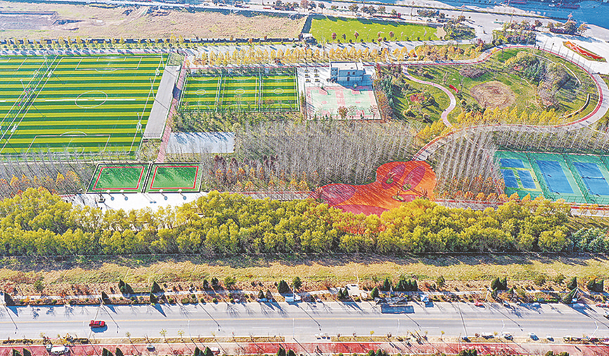 12月3日,航拍的渭河生态运动公园项目中区。该项目位于渭南市渭河南岸,总占地面积234890平方米。项目(一期)分为东区与中区两部分,东区已建成并投入使用,中区目前已进入收尾阶段,预计今年年底投入使用。中区不仅延续了东区的运动主题,更是将海绵城市理念融入其中,致力于打造一个“运动+海绵”的多功能绿地公园。