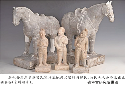 考古人员还发现唐代安定乌支族梁氏家族墓,墓葬呈品字形分布,南部西侧为父梁幹与陈氏、马氏夫人合葬墓,南部东侧为夫人冯宝墓,北部为子梁郎与夫人房氏合葬墓。冯宝为书法名家冯承素之女。梁幹墓出土青石马、青石俑、汉白玉俑等石制陪葬品。其中1件赤发朱唇白玉石俑,初步推测为黠戛斯人形象,这是首次发现完整的黠戛斯人人物形象。梁郎墓中未见石制器物,主要出土了唐三彩釉陶器,其中部分是唐三彩着蓝釉陶器。