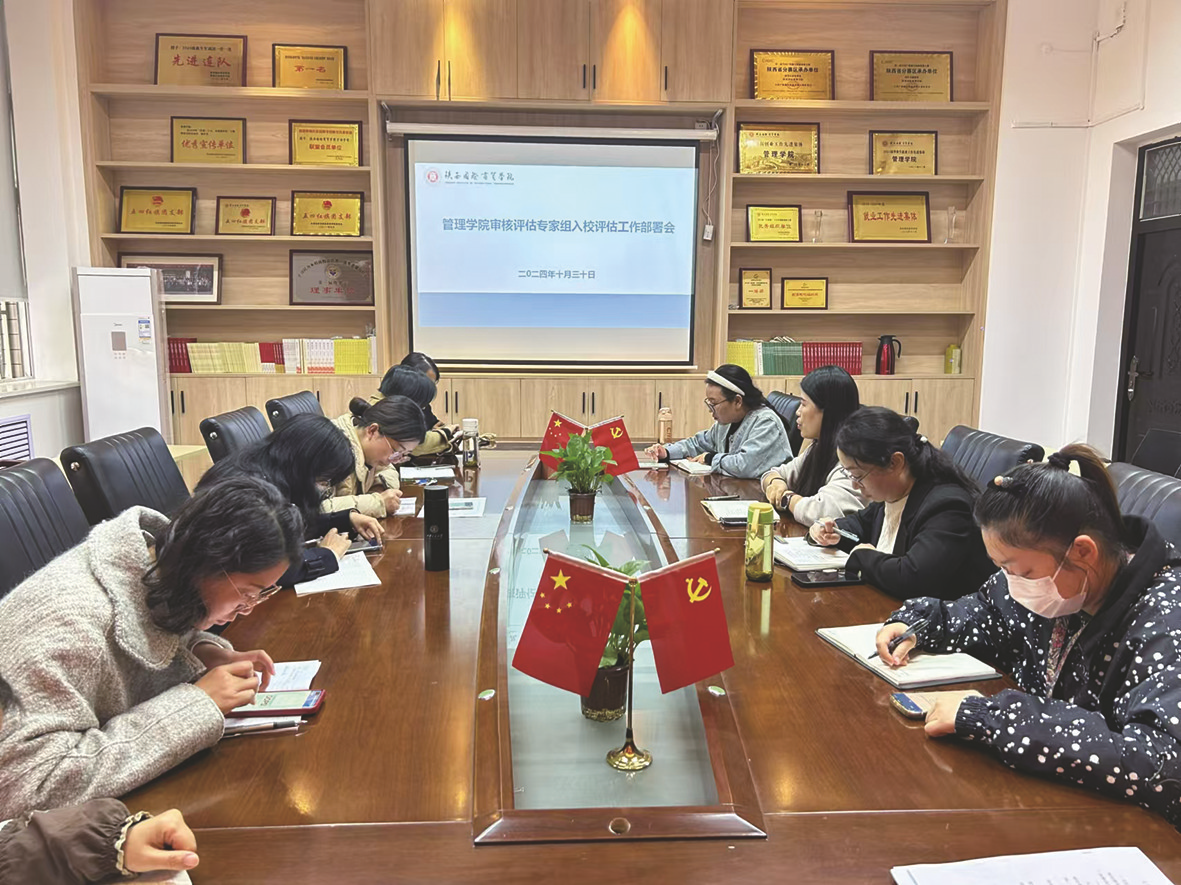图为陕西国际商贸学院管理学院召开审核评估工作部署会。
