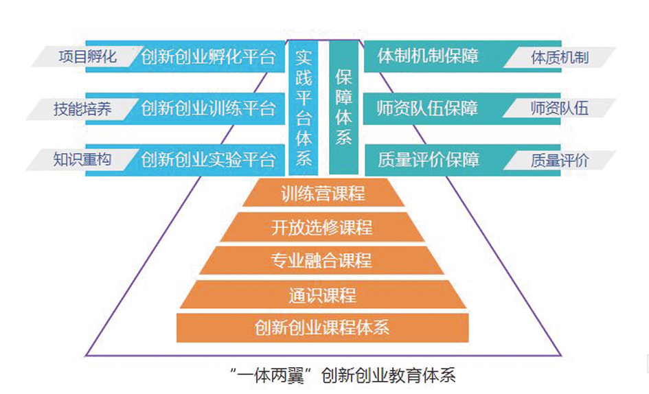 “一体两翼”创新创业人才培养体系,以提高人才培养质量为核心,促进创新创业教育与科技、经济、社会紧密结合,与就业创业需求紧密对接,推动创新创业人才培养各类要素和资源同向同行,形成协同育人效应,走出了一条创新创业人才培养特色之路。