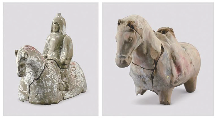 墓葬出土器物达101件(组),种类繁多且质地丰富,包括陶、瓷、铜、铁、石等。其中陶俑数量最多,有镇墓兽、男俑、女俑、骑马俑、劳作俑等多种类型,制作工艺涵盖单范与合范,陶色分灰陶和红陶,部分俑身饰有白彩或红彩,造型丰富多样,展现了当时的人物形象与服饰风格。同时,随葬的两种风格陶俑在北周墓葬中较为罕见,为研究当时丧葬文化和社会风貌提供了独特视角。此外,出土的陶器、铜铁器等也各具特色,如铜器中的铜镜、盂、瓶、砚等,铁器中的刀、饰件等,为研究北周丧葬文化、社会风俗、工艺水平等提供了实物资料。