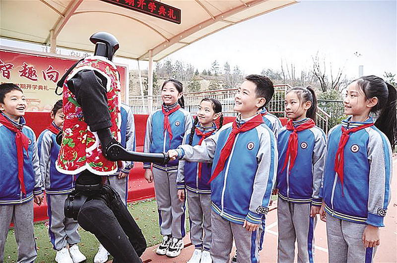 2月17日,来自杭州宇树科技的UnitreeH1春晚同款人形机器人亮相西安市曲江第一学校开学典礼。图为学生和机器人热情互动。