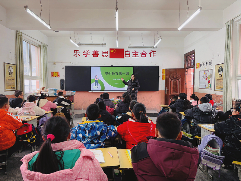 2月14日,安康市平利县大贵镇中心小学全校师生共同迎来开学“第一课”。图为老师借助视频,详细讲解消防、交通安全、食品安全、传染病防治、防欺凌、防溺水等知识。