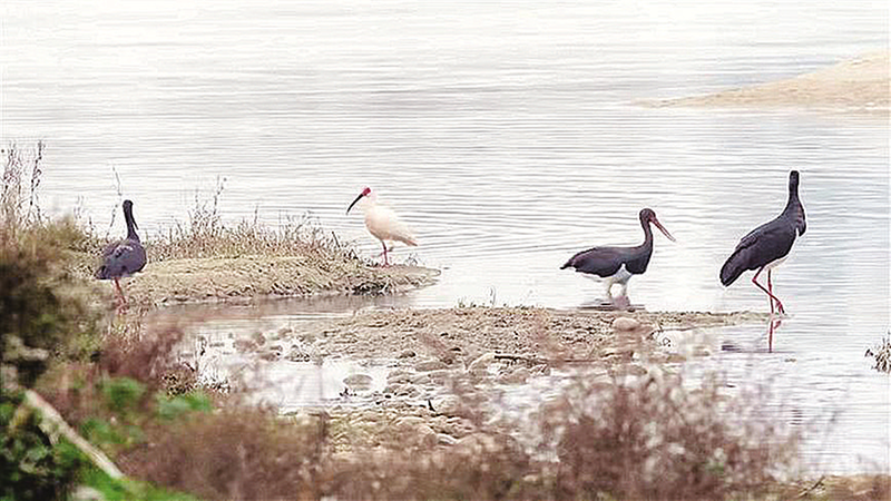 朱鹮被誉为“东方宝石”,是国家一级保护鸟类,目前全球朱鹮种群数量达1.1万余只,其中,陕西境内朱鹮种群数量有7700余只。黑鹳是一种腹部白色、背部黑色、体形优美的迁徙鸟类,也是国家一级保护鸟类,有“鸟中大熊猫”之称。黑鹳对栖息环境要求很高,其觅食水域必须水质清澈、食物丰富。