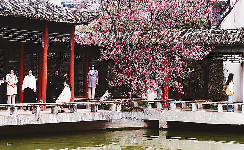 早春时节,汉中各地的梅花次第绽放,红的似火、粉的如霞、白的像雪,各类梅花争奇斗艳,将汉中装点成一幅美丽的春日画卷。图为近日,汉中市中心城区苏景园内梅花竞相绽放,吸引众多市民和游客前往打卡拍照。