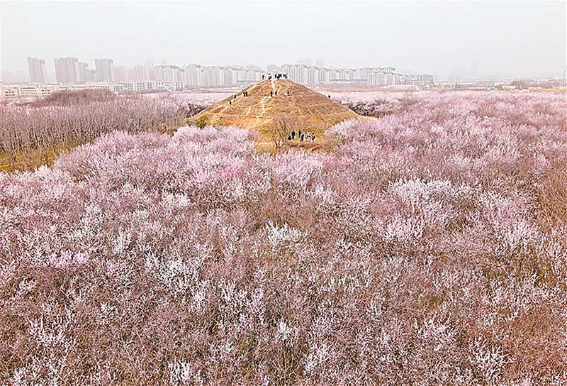 3月12日,西安市长安区大府井村迎来了一年中最浪漫的时刻,山桃花在春风中绽放,形成美丽的花海,市民游客纷至沓来,欣赏美景。图为无人机视角下的山桃花海。