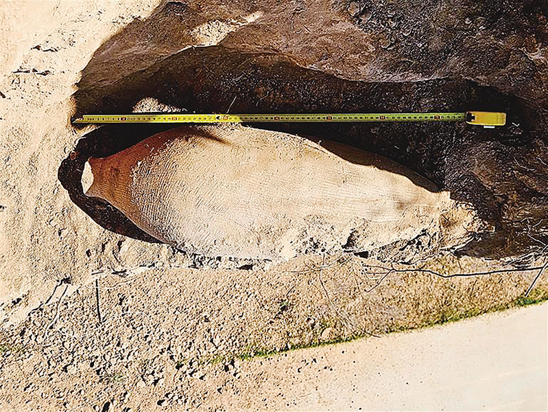 据了解,紫杨遗址位于临渭区紫杨村东二级台地上,属仰韶文化庙底沟类型。渭南市第四次全国文物普查队副队长、渭南市博物馆考古部部长曾鑫介绍,普查人员在紫杨遗址考古调查时,在一处约10米高的断坎上发现疑似泥质红陶残片,经现场采集,最终清理出一件长约70厘米、腹径约77厘米的红陶尖底瓶。这是目前渭南发现的较大的尖底瓶文物标本。