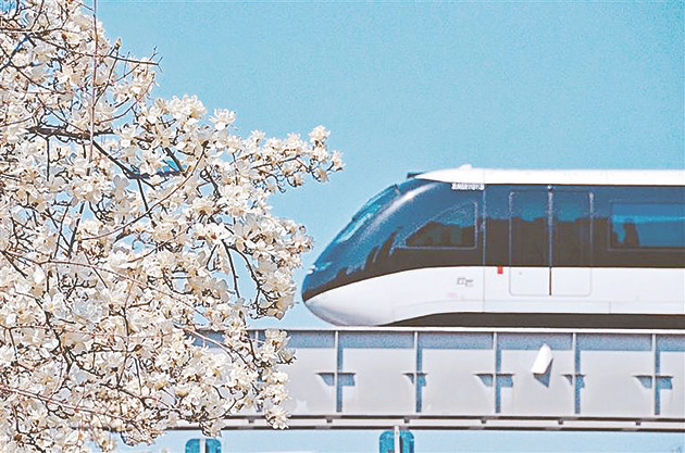 3月22日,西安市硕士路上,驶过的云巴列车与路边玉兰花同框。硕士路是西安著名的玉兰大道,春季玉兰花盛开,如云似海,穿行其中,美不胜收。