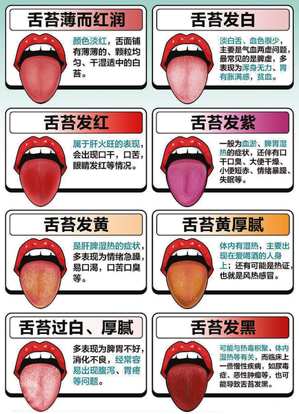 每个人的舌苔颜色都不同,甚至一个人不同时间的舌苔也不同,有的白白薄薄的像撒了糖霜,有的白白厚厚的像刮了腻子……