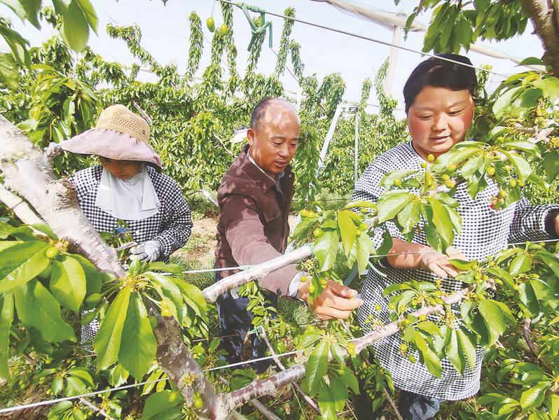 连日来,咸阳市永寿县农技人员深入各大果园,现场指导果农拉枝、疏果、预防病虫害,有效提高果品质量,增加果农收入。图为近日,在永寿县监军街道古屯村车厘子种植基地,农艺师正在指导果农疏果。