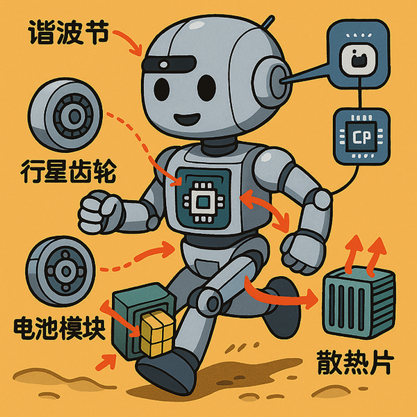 高强度奔跑容易发热。机器人电机运转时就像给它“吃”了大力丸,内部温度飙升,得靠“散热”来降温。目前,大家多依赖金属外壳被动散热,再辅以改良电机绕线和增强导热结构,尽量把热量“赶走”。