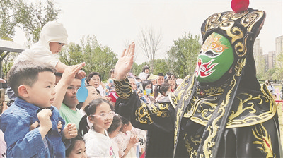 5月5日,咸阳市演艺有限公司和咸阳市群众艺术馆联合主办的魔法大世界亲子游园会在渭滨公园举行。对诗、童话表演、小丑表演和川剧变脸等让孩子们沉浸其中。图为川剧变脸表演。
