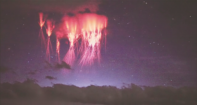 “我们通常说的闪电放电主要发生在十几千米以下的对流层,而红色精灵通常发生在40千米至90千米的中高层大气区间。”刘恒毅说,闪电通常表现为空气击穿放电形成的先导传输和电荷中和过程,而中高层大气瞬态发光现象则主要表现为气体激发后的多种形态的发光现象和相关电磁现象。