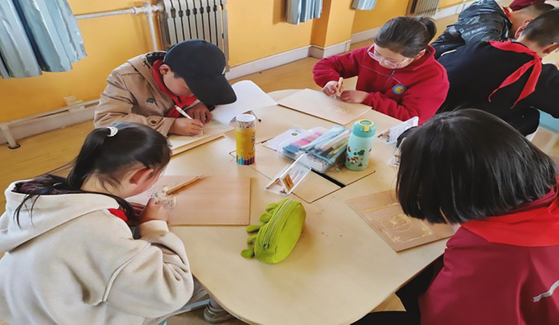 图为田家庄镇中心小学的学生们制作木板年画。