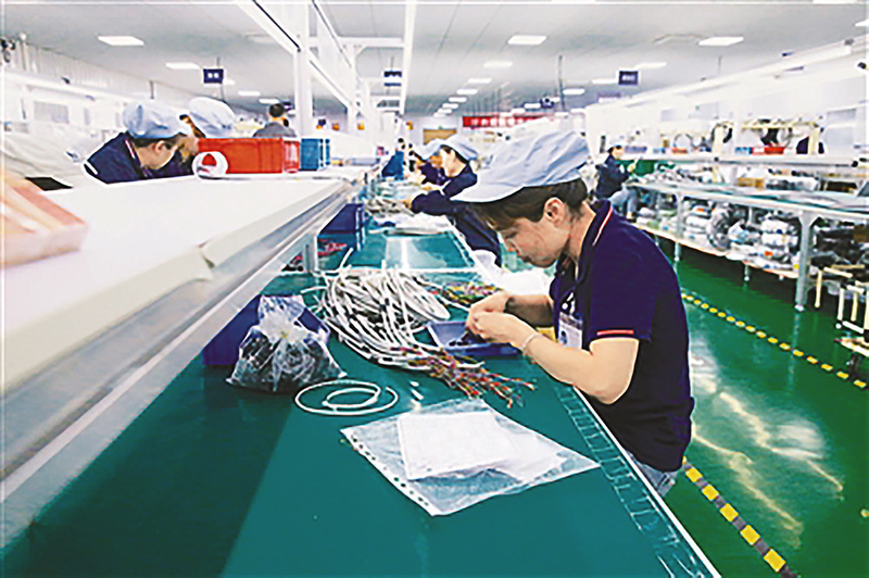 6月17日,在咸阳兴平高新区陕西新奥荣电子科技有限公司生产车间,工人在生产线上忙生产。兴平高新区以高端化、特色化、绿色化为核心,重点发展航空装备、航海装备、新材料特色产业,聚力打造区域航天航空航海科创新城。