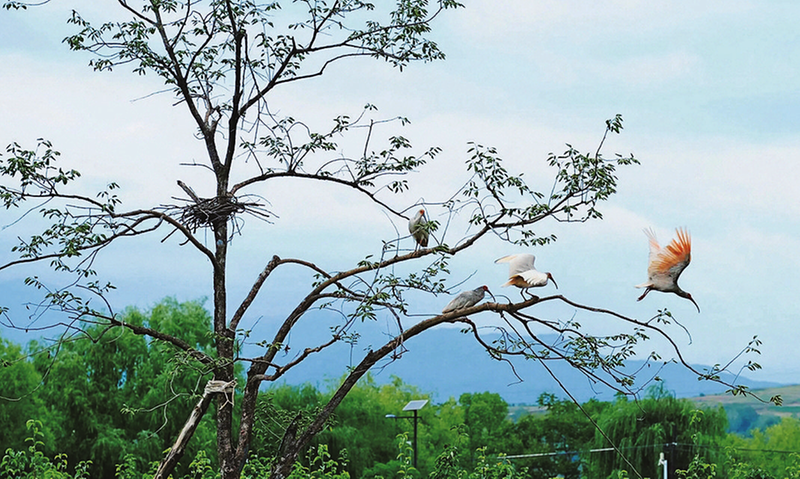 汉中市洋县纸坊街道草坝村位于朱鹮保护核心区,近年来,该村积极探索“中心基地+核心片区+专业农户”现代农业发展路径。目前,全村认证有机梨园3800亩,有机稻米、油菜基地6050亩,年收益6000万元以上,实现了生态效益与社会效益双赢。图为6月25日,成群的朱鹮在草坝村驻足休憩。