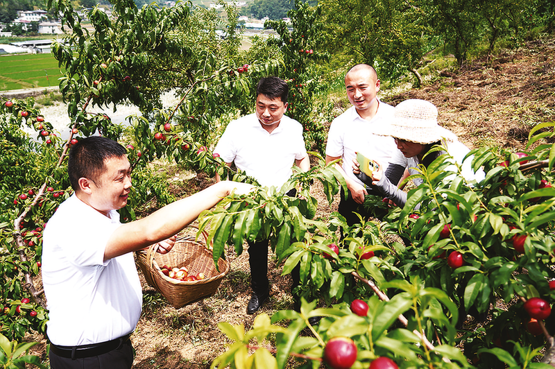 近年来,安康市近1300名第一书记在其所在的镇、县区域内充分发挥自身优势,围绕组织共建、产业共兴、产品共销、人才共育、治理共抓等方面协同开展工作,由“个体”凝聚为“整体”,助力乡村全面振兴。图为6月24日,在安康市岚皋县孟石岭镇,当地多个村的驻村第一书记正在拍摄创作用于桃子销售的短视频。