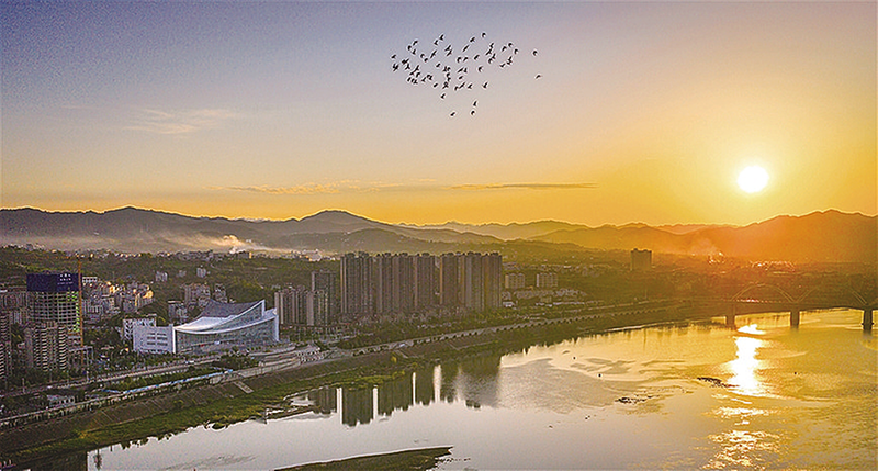 6月29日,群鸟掠过安康汉江大剧院上空,袅袅晨雾与粼粼波光勾勒出安康特有的生态图景。