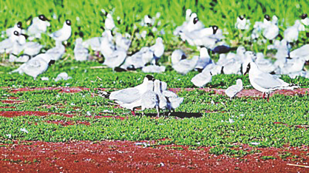 在保护区中心湖,白鹭、苍鹭、白琵鹭、鸬鹚在一簇簇芦苇丛中“安家落户”。空中俯瞰,鸟巢一个挨一个,每个鸟巢都有两三只雏鸟,身上绒毛还未褪去,个个叽叽喳喳,焦急地等待父母投喂的鱼虾大餐。走在保护区巡护道路上,突然,2只灰色的鸟儿张开翅膀,大声尖叫,拦下了巡护员的车辆,原来是灰头麦鸡一家正在觅食,直到3只雏鸟躲进草丛,“危险”解除,灰头麦鸡才允许车辆通过。
