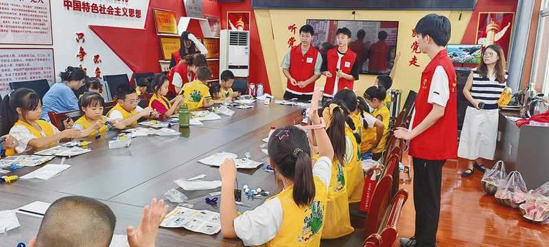 7月24日,在宝鸡市千阳县城关镇西关社区活动中心,一群穿着红色马甲的科技志愿者们带来显微镜、机器人和各种“神奇材料”,为社区儿童暑期托管班的孩子们开启一场别开生面的科学之旅。
