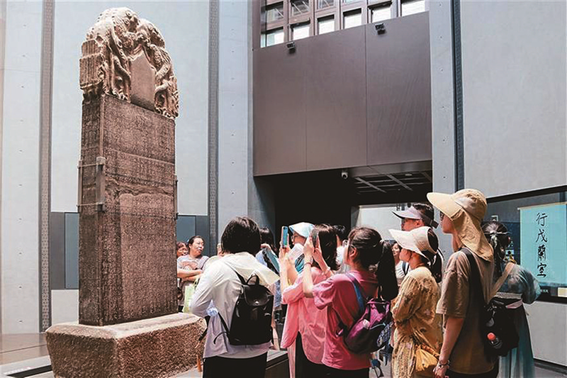 炎炎夏日,西安碑林博物馆北馆区清凉怡人,游人如织。作为中国书法艺术的宝库,馆内陈列的众多珍贵碑刻吸引了参观群众驻足欣赏、互动体验,感受跨越千年的艺术与历史文化魅力。图为7月25日,游客在西安碑林博物馆参观游览。