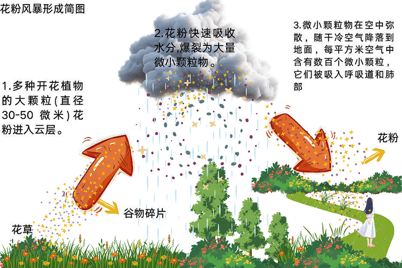马艳良解释,雷暴天气时,强风会将花粉、霉菌等过敏原卷入空气中。这些过敏原颗粒在雷暴的强气流作用下,会被打碎成更小的微粒,直径通常在2至3微米,正好易被人体呼吸道吸入。这些微粒随着气流沉降到地面,导致空气中可吸入过敏原的浓度急剧增加。人们吸入这些过敏原微粒后,气道黏膜的通透性会发生改变,让过敏原更容易进入气道,从而引发过敏反应,导致哮喘急性发作。