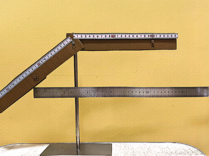 (5)通过粘贴纸皮调整异型杠杆的质量,使其在水平位置达到平衡状态;在杠杆支架上水平粘贴钢尺(如图3所示)。