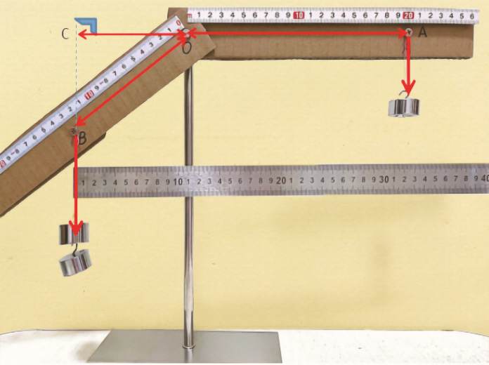 (1)将教具放置在水平桌面上,确保异形杠杆处于水平平衡状态。