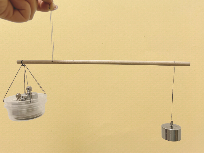 (3)用缝衣线将一个50g的钩码悬挂于提扭的另一侧作为秤砣,尝试确定空秤盘时杆秤水平静止的零刻度。此时学生发现一个问题:由于塑料小碗太轻而钩码太重,当秤盘与秤砣分置提纽的两侧时,杆秤无法水平静止。学生需要寻找解决办法。通过讨论分析,学生决定通过增加空秤盘质量(如添加质量相对均匀的硬币)的方式使杆秤达到水平静止状态,并用记号笔标记零刻度的位置。