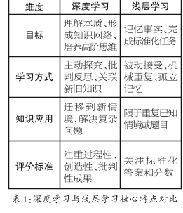深度学习是指学生在教师的引导下,通过主动参与、批判性思考、概念联结与迁移应用,超越浅层记忆与机械训练,形成对知识本质的理解,并能在复杂情境中灵活解决问题的能力。(深度学习与浅层学习的核心特点对比如表1所示。)
