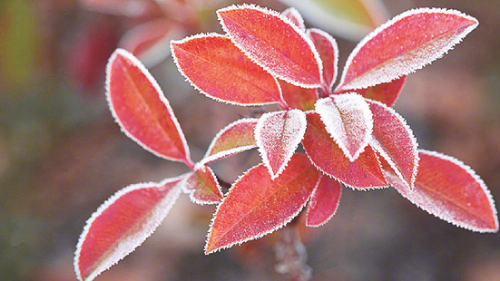 再来观“天气”。春夏时,气温高,日照长,水分充足,有利于叶绿素的大量合成,叶绿素在叶子里占据优势。叶绿素吸收蓝色光、红色光,对绿色光则有很强的反射作用,因此,我们看到的叶子是绿色的。等到秋凉漫上枝叶,叶绿素合成受阻,原本被掩盖的、相对稳定的叶黄素、类胡萝卜素等所占比例上升,绿叶渐变为黄、橙、红等颜色。霜降时节,北方地区气温骤降,树叶中的叶绿素加速分解。此时,天朗气清,透光度好,更能激发枫树、乌桕等树叶中花青素的显色效果,让红叶色泽饱满、层次分明,达到最佳观赏状态。可见,“霜”与“叶”的机缘巧合,在于时序,在于温度、光照等气象因素的加持。