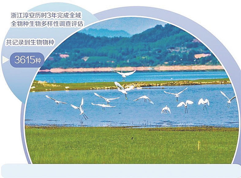 山水相映的淳安县千岛湖是一个生机盎然的“生态王国”。淳安县历时3年完成全域全物种生物多样性调查评估,共记录到生物物种3615种。为保护生物多样性,淳安县联合浙江大学等单位建立千岛湖生态学科教学、生物多样性研究基地,持续引入高端智库、顶尖专家,参与千岛湖生物多样性保护研究,发布实施杭州市首个县级层面的生物多样性保护战略与行动计划,从岛屿到湿地,编织出一幅立体的生态画卷。
