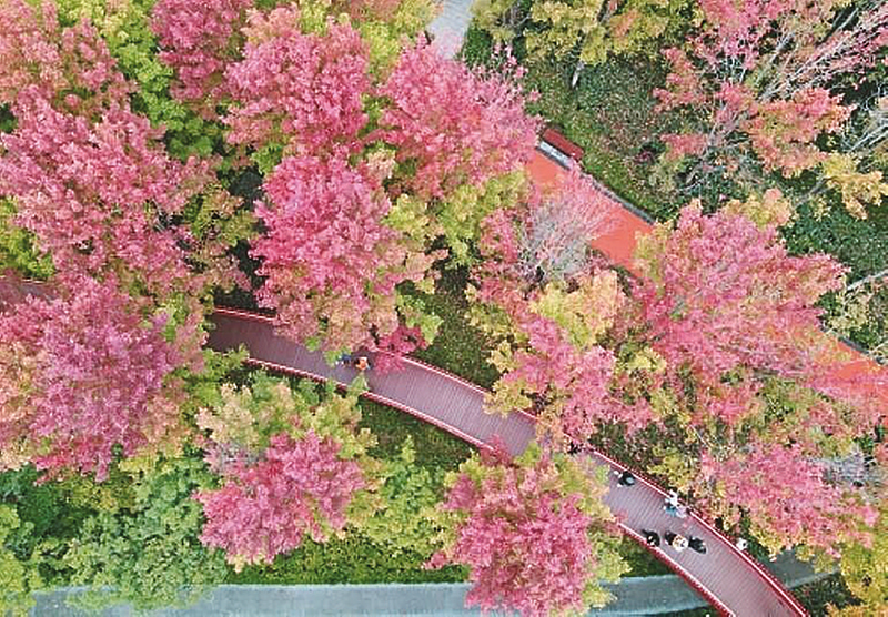10月7日,西安幸福林带枫叶进入最美观赏期,红黄绿叶片交织如画,红色栈道如丝带穿梭其间。空中俯瞰,栈道与枫林相映成绝美画卷。游客或拍照或漫步,享受秋日浪漫。图为无人机视角下的栈道和枫林。