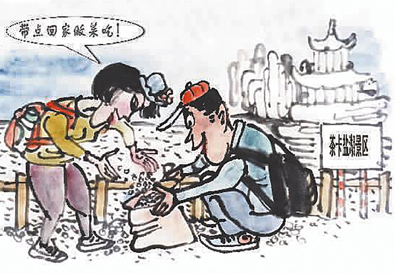 近日,有网友在知名旅游地茶卡盐湖拍到一段视频:几名游客蹲在路边,将用于铺路的盐装入塑料袋中带走。如此带盐引发公众质疑。工作人员表示,用塑料袋大量装盐带走的情况比较罕见,从生态保护、文明旅游的角度来看,不提倡把盐带走。