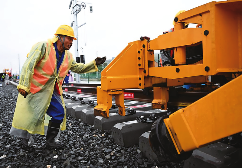 10月11日,在西康高铁建设现场西安东站至牛背梁站区间,施工人员将首对500米长的无缝钢轨平稳铺设在无砟轨道板上,标志着由西成客专陕西公司建设、中铁一局施工的西康高铁全线铺轨正式启动。图为施工人员在西康高铁西安东站至牛背梁站区间铺轨现场作业。