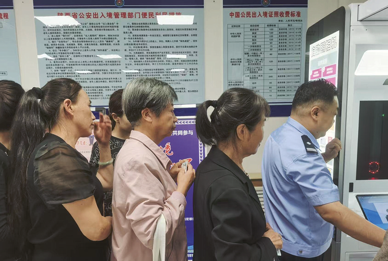 近期,榆林市靖边县公安局治安大队出入境管理中队迎来“银发”办证高峰,日均业务受理量增至80人次,其中老年人占比达90%。面对这一办证热潮,靖边公安出入境积极作为,推出一系列贴心服务,让老年群体办证之路更加便捷、温暖。图为引导员协助老人操作智能设备。
