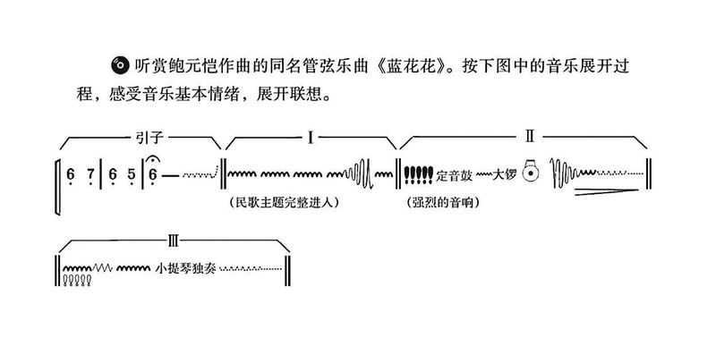 双重编码理论强调视觉符号与听觉记忆相结合,有助于加深学生对音乐要素的理解。在新教材中,管弦乐曲《蓝花花》的教学便充分运用了这一理论。教材通过图像传递了文字难以表达的信息,当学生在观看图片的同时聆听音乐,这种视听觉的双重刺激相较于单纯听辨音乐,能够取得更佳的教学效果,学生也更容易形成长期记忆。