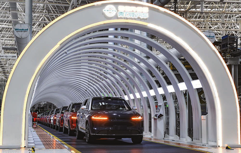 这是在位于重庆市两江新区的赛力斯汽车超级工厂拍摄的即将下线的新能源汽车。