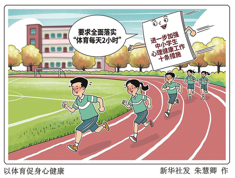朱慧卿 作 教育部办公厅近日印发《进一步加强中小学生心理健康工作十条措施》(以下简称《措施》),其中第二条专门强调要全面落实“体育每天2小时”,把体育活动作为促进学生心理健康的重要着力点。