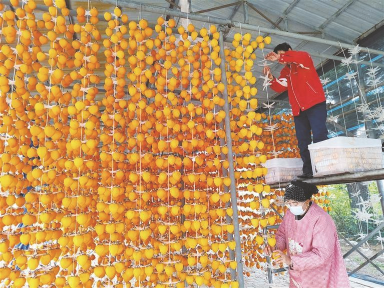 11月2日,咸阳市永寿县监军街道永安村村民将用来制作柿饼的柿子挂上架。据了解,该县柿子种植面积已超过3万亩。