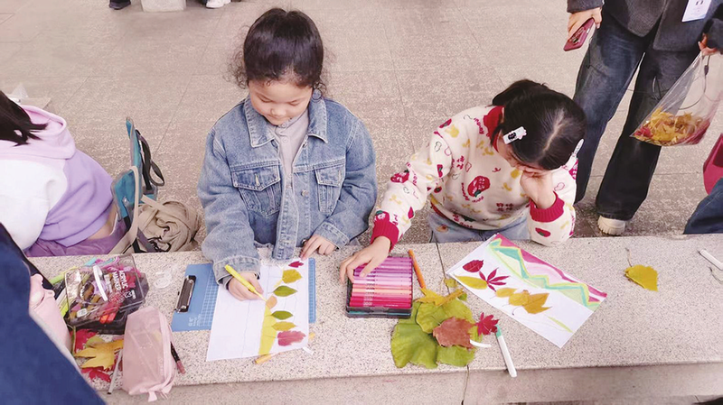 理论学习后,探索转入创作。孩子们手牵手走进小径,弯腰拾起金黄的银杏叶、火红的枫叶。在家长的陪伴下,他们用落叶拼贴出心中的童话世界,“这片叶子是蝴蝶的翅膀,它要飞去南方过冬。”“这是一只漂亮的孔雀!”王春兰看后频频点头道:“你们不仅看见了自然的美,更用心灵重新创造了它。”