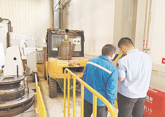 工作人员检查企业淘汰叉车封存情况。 本报讯 (王晓占)近日,宝鸡高新区生态环境中心将非道路移动机械监管“关口前移”,上门对宝鸡石油机械有限责任公司热工分公司、钻机分公司进行叉车尾气排放专项检测及淘汰车辆封存情况核查。