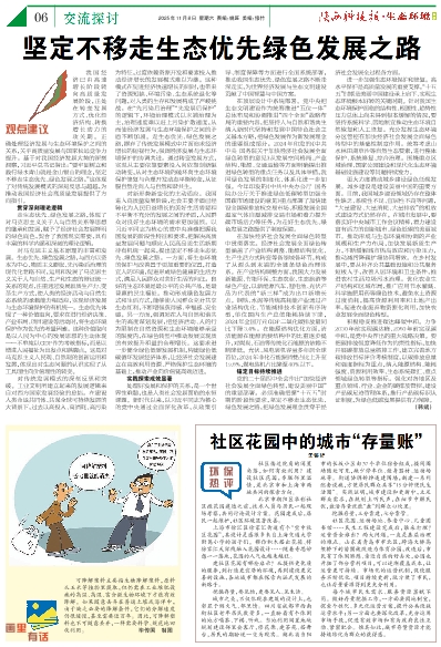 在顶层设计中系统部署。党中央把生态文明建设作为统筹推进“五位一体”总体布局和协调推进“四个全面”战略布局的重要内容,把坚持人与自然和谐共生纳入新时代坚持和发展中国特色社会主义基本方略,把绿色发展作为新发展理念的重要组成部分。2024年印发的《中共中央 国务院关于加快经济社会发展全面绿色转型的意见》从发展空间格局、产业结构、能源、交通运输等方面明确提出推进绿色转型的重点任务以及具体举措,我国绿色发展的制度化、体系化进一步加强。今年印发的《中共中央办公厅 国务院办公厅关于推进绿色低碳转型加强全国碳市场建设的意见》重点部署了加快建设全国碳排放权交易市场、积极发展全国温室气体自愿减排交易市场和着力提升碳市场活力等任务,为走好生态优先、绿色发展之路提供了制度保障。