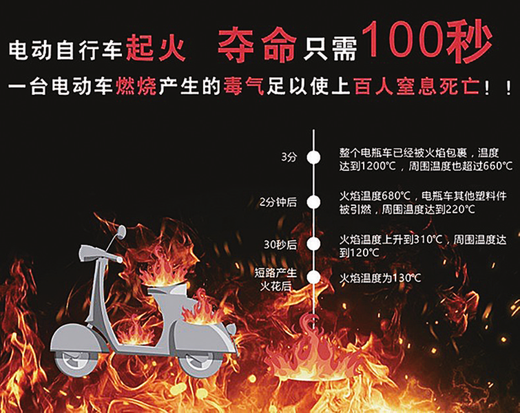 电动自行车火灾特点 据消防救援机构电动自行车火灾实验显示,电动自行车电池短路产生火花后,火势蔓延和温度攀升速度极快:5秒内火苗即从电池表面蹿出,火焰温度达130℃;30秒后燃烧产生的有毒浓烟便能覆盖整个房间和楼道,室内温度升至120℃ ;2 分钟后 火焰温度 达680℃,室内温度介于 180℃—220℃之间;3分钟后火势进入猛烈燃烧阶段,电动自行车被火焰完全包裹,火焰温度高达1200℃,室内温度突破660℃。由此可见,电动自行车火灾具有燃烧速度快、有毒烟气多、短时温升快。