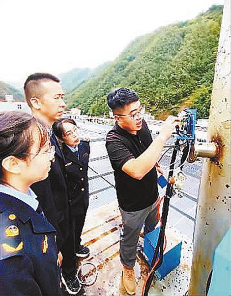 近日,商洛市生态环境局山阳县分局执法人员在企业生产车间30米高的锅炉烟囱监控平台,详细查看粉尘浓度在线测量仪采集数据情况。图为执法人员正在显示器上查看数据。