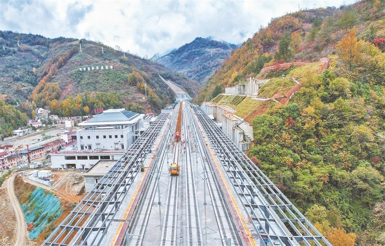 随着最后一对500米长钢轨平稳铺设到位,西康高铁轨道成功延伸至镇安西站。这标志着项目铺轨工程取得阶段性突破。图为11月10日,西康高铁镇安西站铺轨施工现场一角。