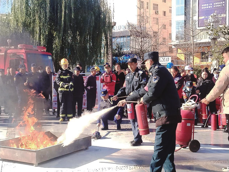 冬季来临,宝鸡市凤翔区联合多部门开展冬季消防安全大练兵系列活动。图为消防队员现场指导工作人员开展灭火器实操训练。