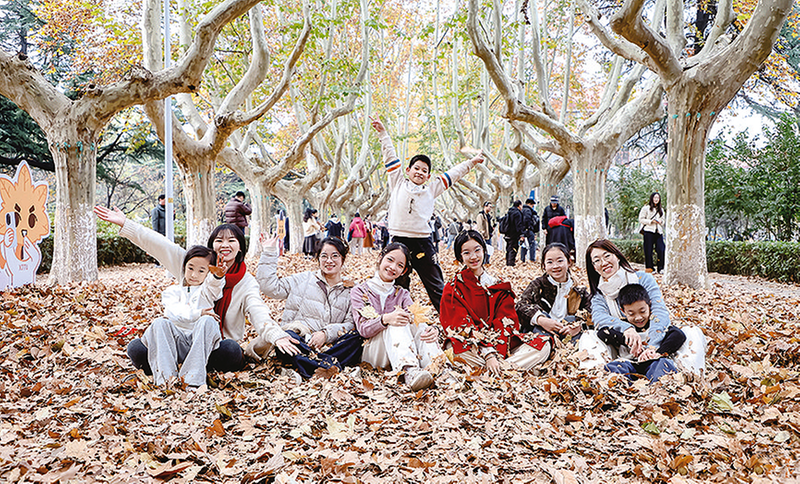 游客在西安交通大学兴庆校区彭康路金色梧桐道打卡留念。