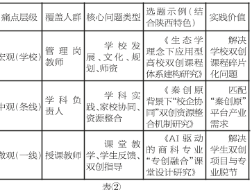 2.明晰变量关系:明确自变量—因变量—控制变量。如,“痛点:双创导师企业经验不足”可命题:《双创导师双聘双评机制对陕西民办本科院校双创项目岗位匹配度的影响研究》,其中双聘双评呼应陕西省产教融合政策,岗位匹配度可通过项目落地企业数量化。